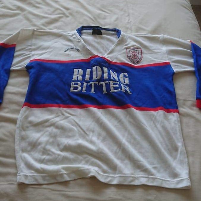 CS – My first shirt that I recall getting was the 1991/93 home shirt as mentioned and pictured earlier. At the time the club shop was also selling the previous home and away (1989/91) shirts off so my parents bought me both with the classic red band (home) blue band (away) with Riding Bitter as the only sponsor. I still to this day have the away shirt (pictured below).
