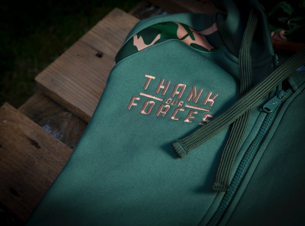 The colour combination is beautiful. Green and gold work so well with each other and it’s good to see different tones used to make up the camo effect detailing. Working the Club Crest in its usual colourway wouldn’t have worked as well as what we have, in my opinion. The Crest along with the Thank Our Forces wordmark blend in well with the design. Can you see what they’ve done there? Smart.