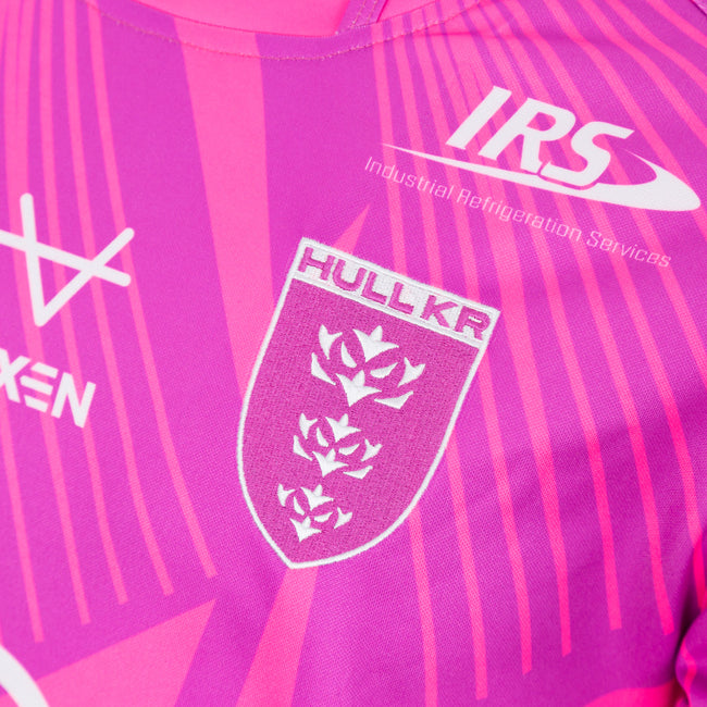 The shorts for the electric pink kit are solid purple, with a flash side panel design. Once again, all sponsors appear in white, including Hull KR Shirts partner Steve Leaming Plant. We have yet to see the socks that will be worn with the kit, but I believe they will be all pink, with a purple turnover.