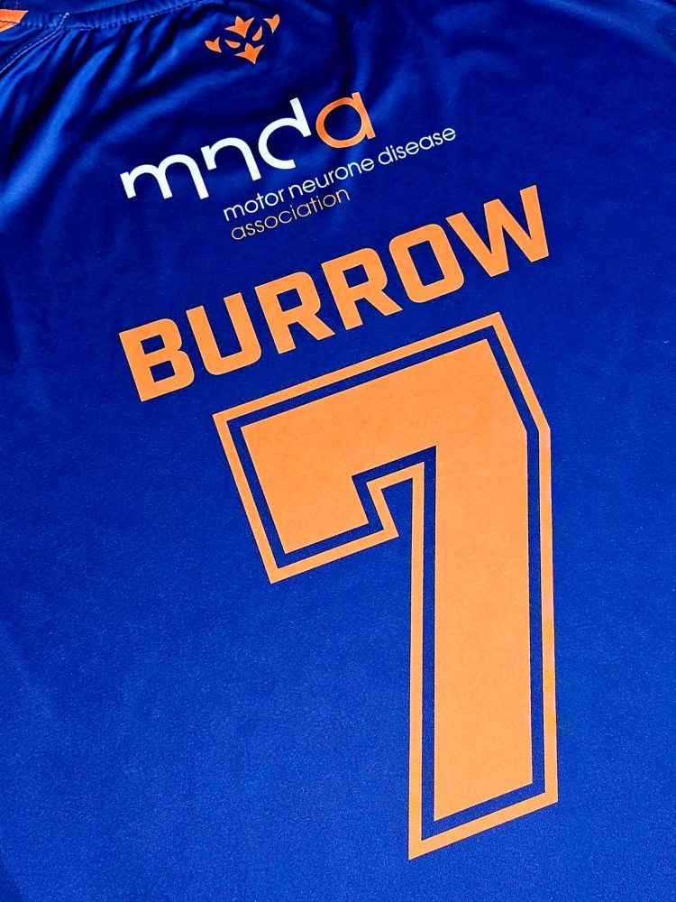 On the reverse of the shirt, the main feature is ‘Burrow 7″ in orange. Above this is the MNDA logo in its natural colourway with the Hull KR Robin icon below the neckline. There is some sleeve detail, with an orange stripe going from neckline to cuff.