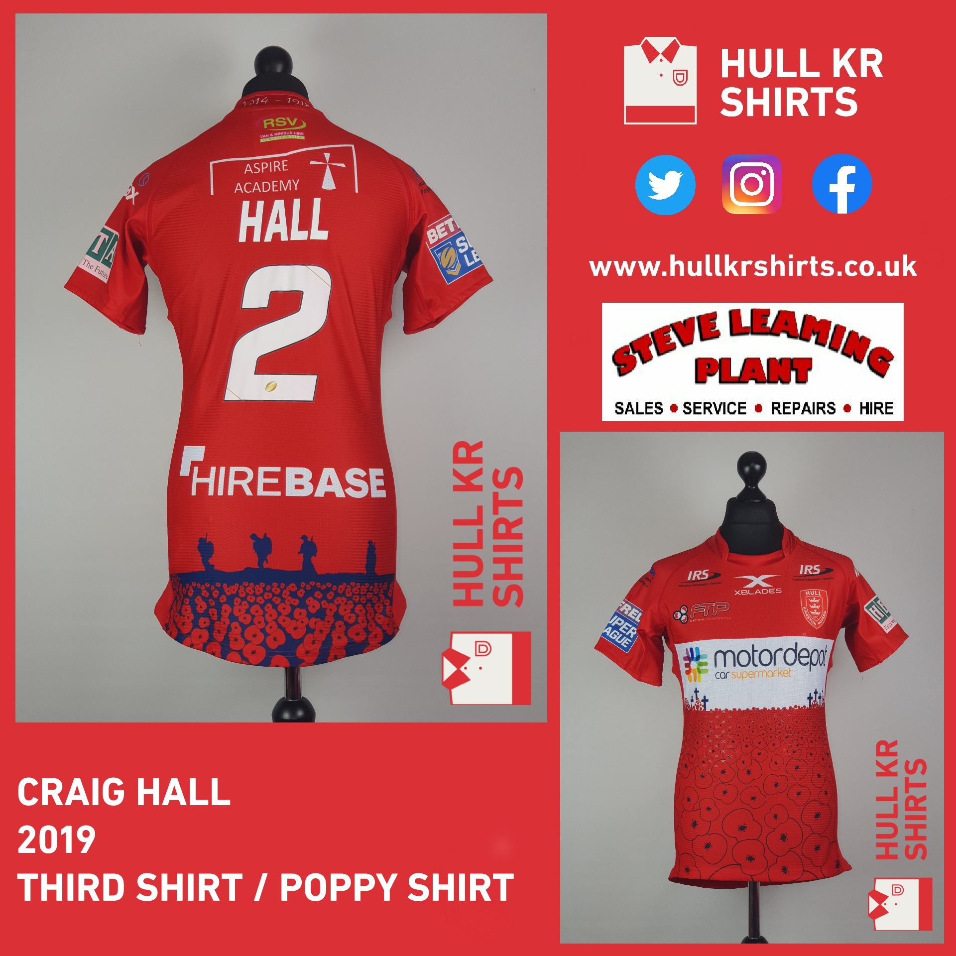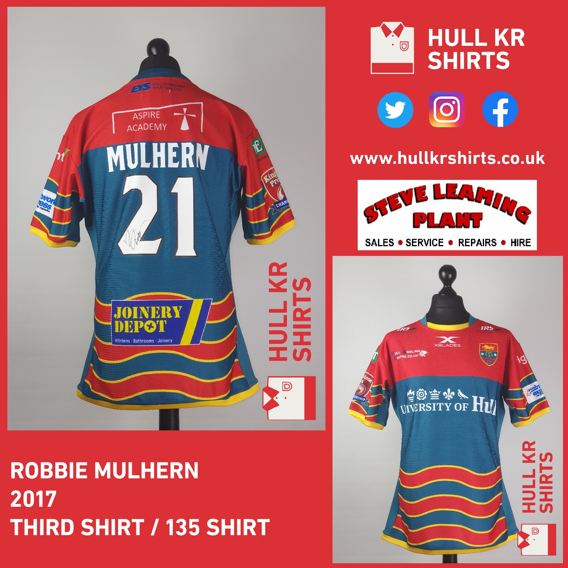 THIRD/135: The third kit had its design inspired by the Hull KR heritage crest, which has been used on key anniversaries throughout the clubs’ existence. The kit featured an updated heritage crest to feature the number ‘135’ as 2017 marked the clubs’ 135th anniversary. The kit was first worn with matching shorts against London Broncos. However, due to a ‘fit’ issue, the players opted to wear the white shorts from the away kit on the other three occasions it was worn, against Halifax, Widnes Vikings and Warrington Wolves.