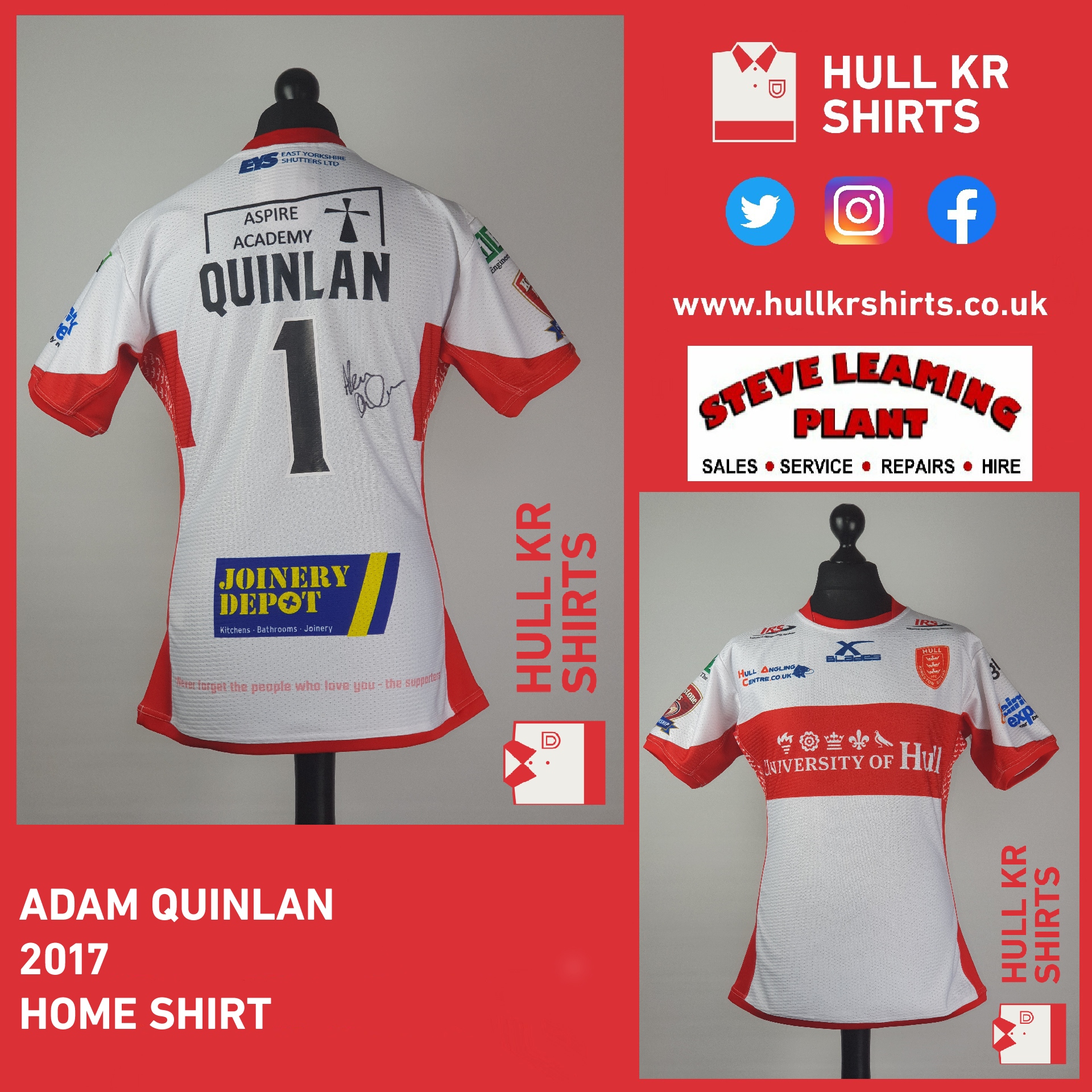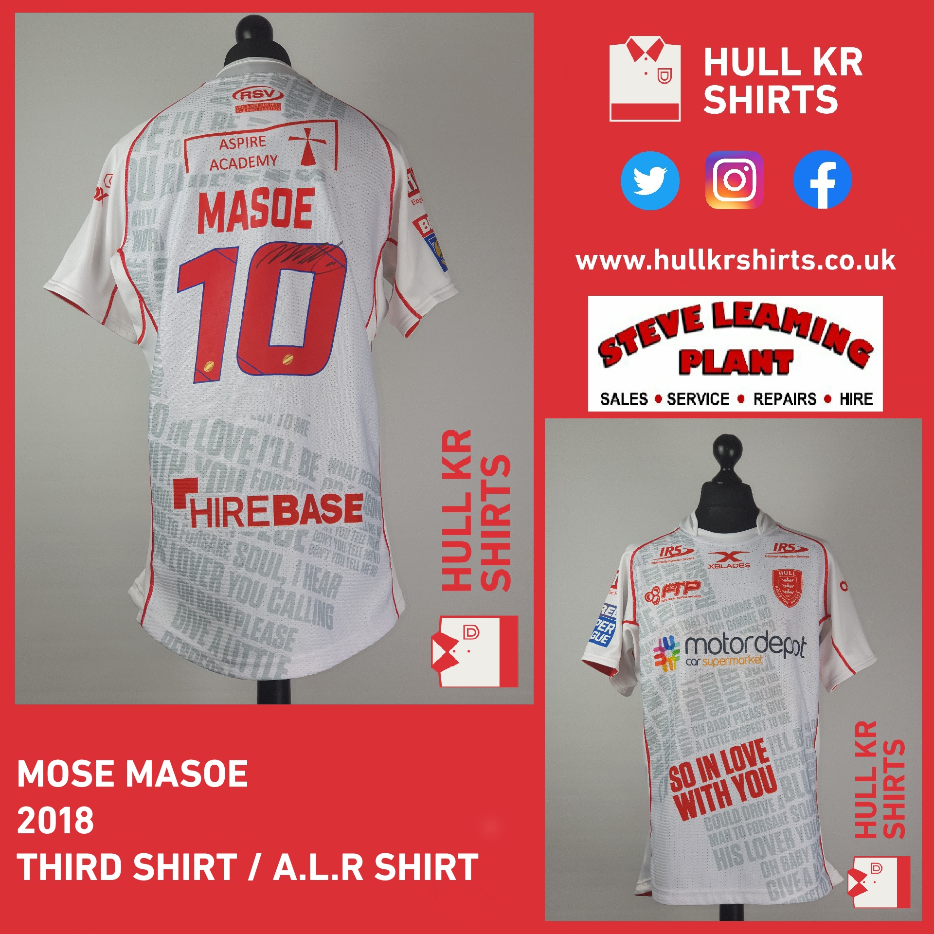 THIRD/ALR: The third kit was another tribute shirt (of sorts, anyway). In 2015 Hull KR had adopted the Erasure classic, ‘A Little Respect’ as one of their club anthems after it was sung in the stands and three years later the idea to have that commemorated on a shirt stuck. The main body of the shirt was white, with lyrics featuring across the shirt in a pale grey. The words “so in love with you” were displayed on the front body of the shirt in red, to really lay the emphasis on that section of the lyrics. This was worn a couple of times in May, with ‘MLS’ as the main shirt sponsor, but was worn much more in the latter stages of the season with ‘Motordepot’ branding. It didn’t have kit specific shorts and socks, though, as it was worn with the home kit shorts and socks. A clever idea, but the execution could have been better.