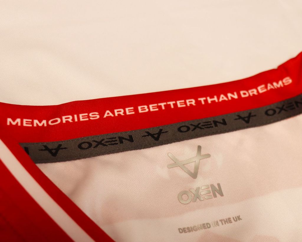 Completing the home ensemble are red shorts, with white side panel ‘wing’ detailing and red socks with a white turnover with a red band featuring the OXEN icon above the band. The wing design on the shorts is much more effective than it is on the shirt. Steve Leaming Plant and Instamod both return with the addition of Novem and RugbyLeague.com appearing as sponsors on the shorts. The additional sponsor on the shorts for the 2025 season sees OXEN move their branding to the side panel.