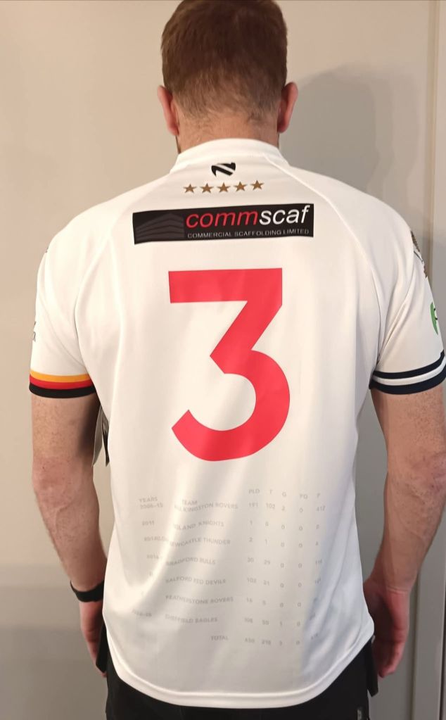 The shirt sponsors have now been confirmed. PBS takes the main front of shirt sponsor position, and it doesn’t look out of place at all, which is a big plus. On the sleeves, Apave and Gateway accompany the colours of Featherstone Rovers and Bradford Bulls on the shirts cuffs. On the reverse of the shirt, Commercial Scaffolding’s branding can be found between the 5 gold stars, representing the 5 professional clubs that Kris played for, and his iconic squad number, 3. Also on the back of the shirt, O’Neills icon branding has been added above the 5 stars.
