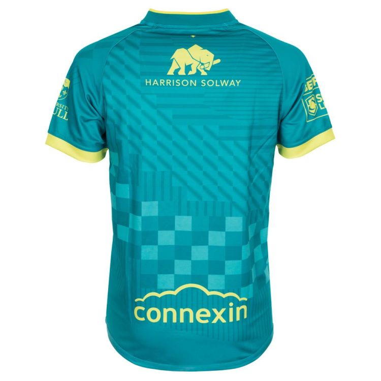 The LCD design elements continue on the back of the shirt, in an all-over print that mirrors the pattern on the front. Both Harrison Solway and Connexin feature in yellow – they have also been dye-sublimated in yellow to the teal shirt.