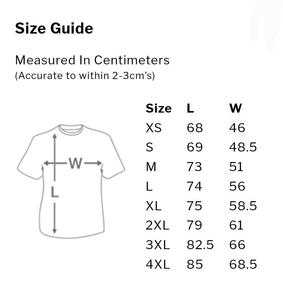 To place an order, you can send an inquiry email to hullkrshirts@gmail.com or drop me a direct message via any of my social media platforms and I will get back to you with quantity, size and payment details. Below is a size guide supplied by the supplier I will be using, for anyone who requires it.