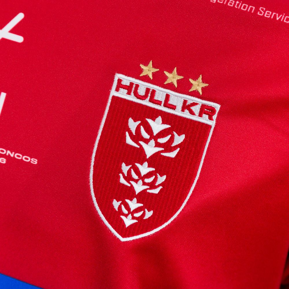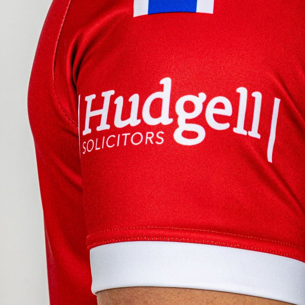 Also in white are the matching sleeve cuffs. On each shoulder, starting at the collar and working its way towards the sleeve is a thick blue band with white stripes on either side. The design breaks away for the sleeve sponsors which are University of Hull and Hudgell Solicitors – which features as a sponsor on a Hull KR shirt for the first time in over 25 years!