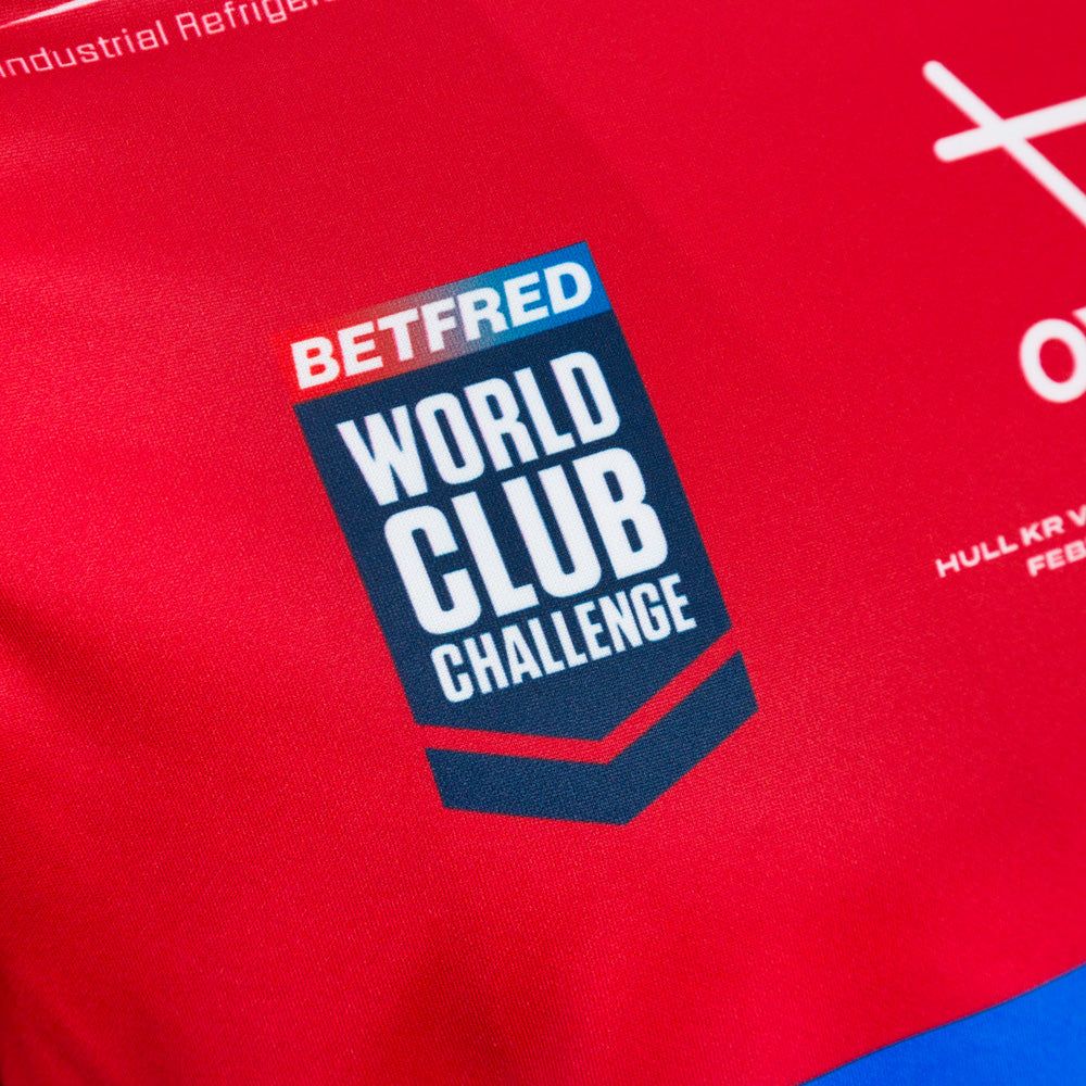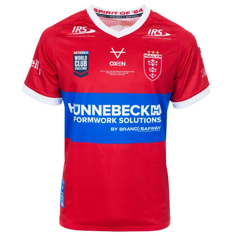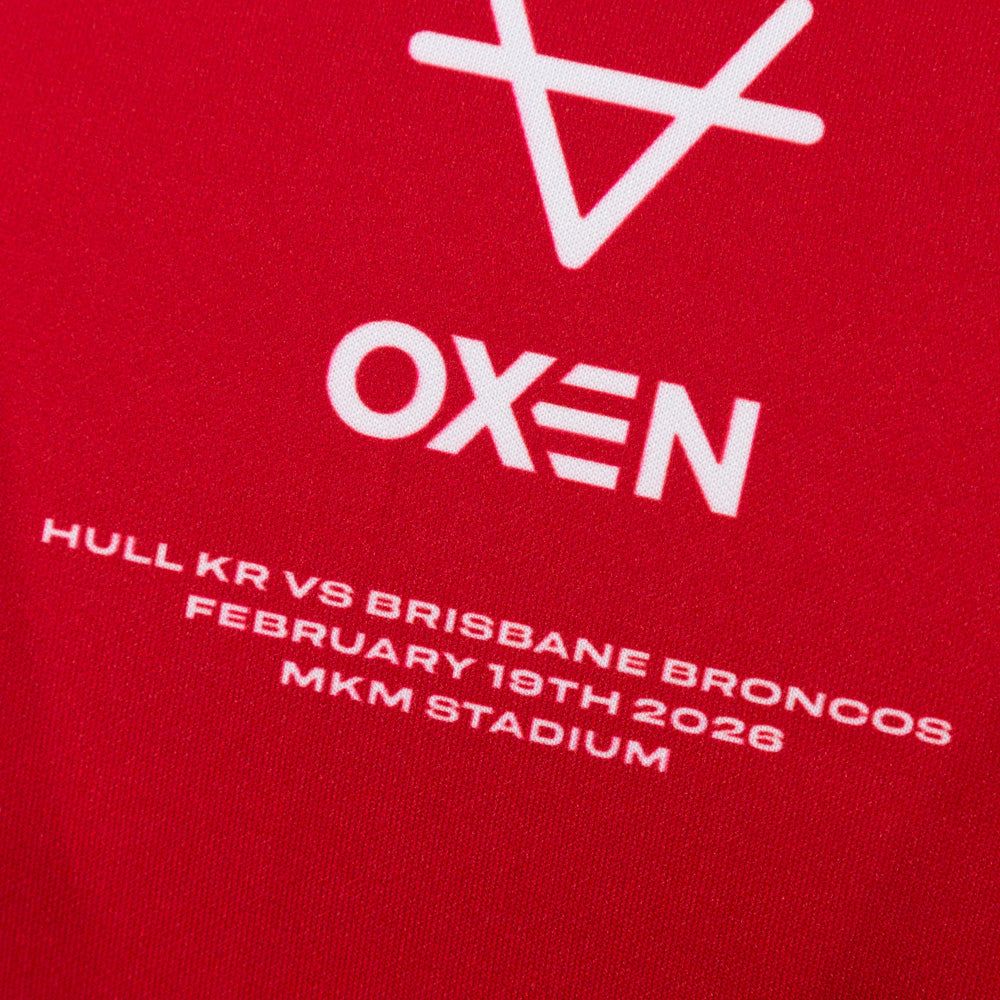 Across the chest centrally is the OXEN branding, on the right as wearing is the Betfred World Club Challenge logo and on the other side is the Hull KR club crest with three golden stars above it. One for each of the trophies that Hull KR won in 2025. Below the OXEN logo and wordmark is dye sublimated game details which read “Hull KR vs Brisbane Broncos, February 19th 2026, MKM Stadium”