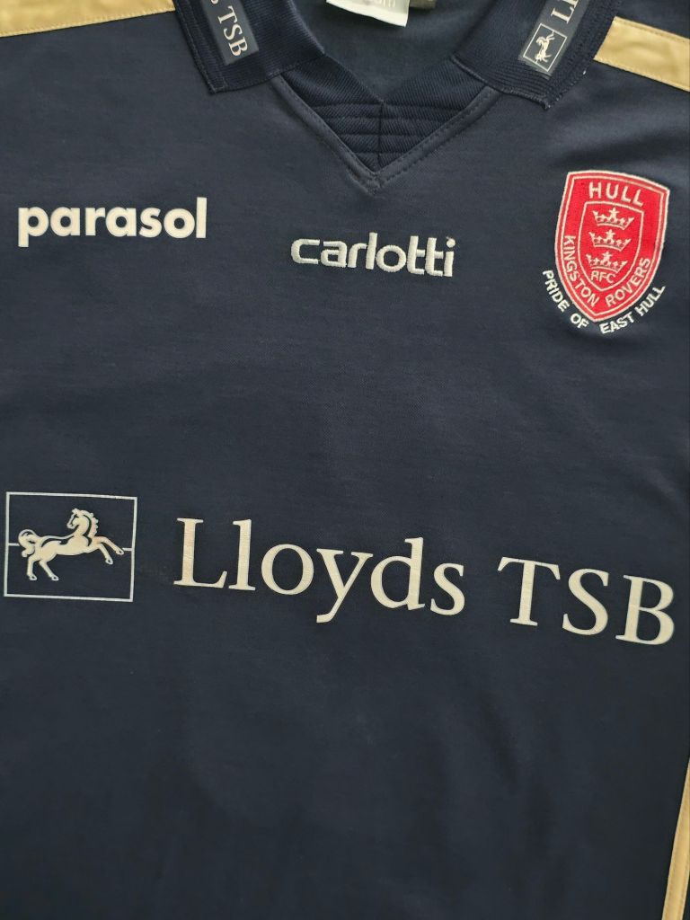 2007 saw Hull KR make their debut in Super League with Carlotti. The home kit is probably the one that most people will gravitate towards, but the away offering shouldn’t go unnoticed. It is a simple navy shirt with gold detailing and my favourite – a turnover collar! The shirt that wasn’t overpowered with sponsors, but those that did appear were heat-applied in white and are very inoffensive!